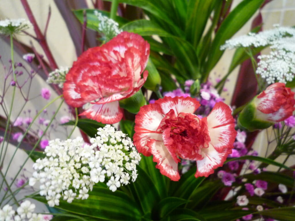 こちらのカーネーションは白に赤色が映えていて、サイズ的には小さいですが、パッと視線を集めるお花です。