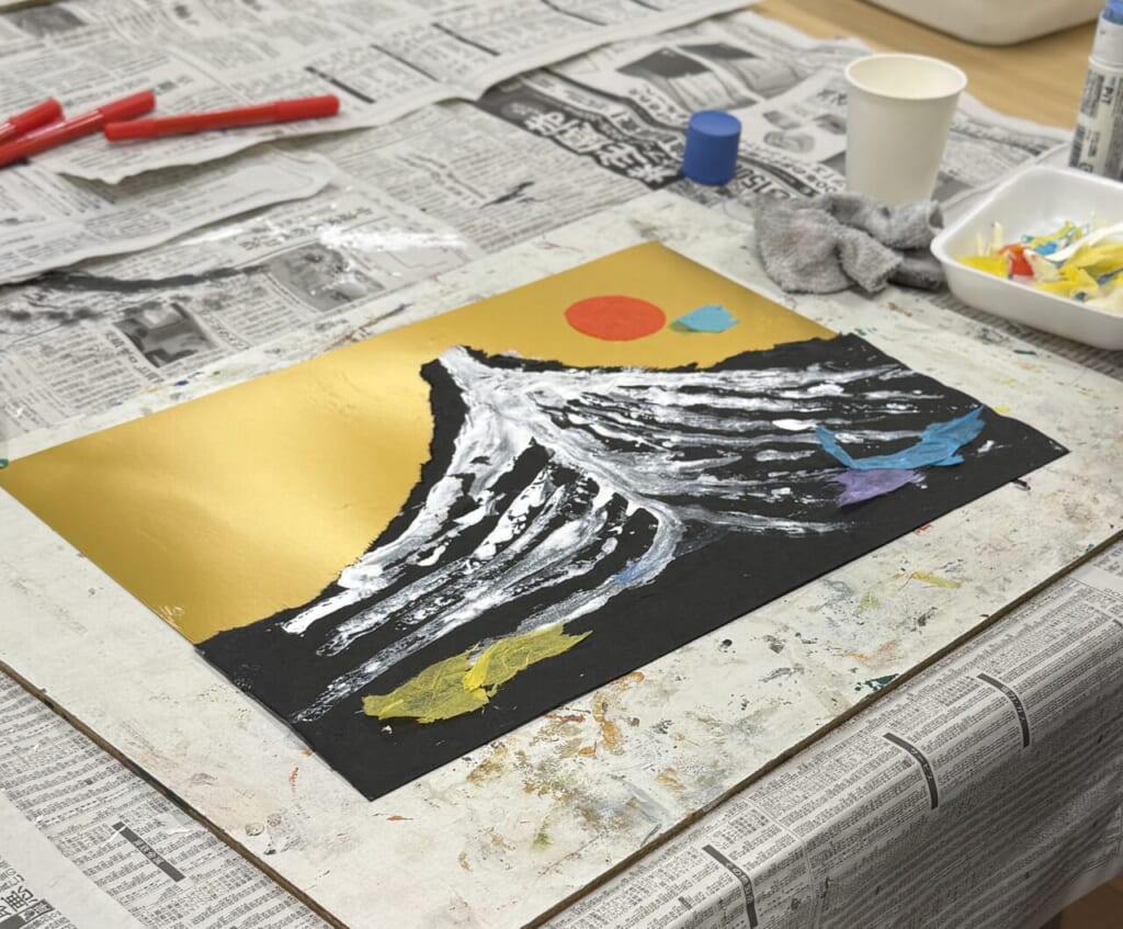 「祝い富士」 おめでたい色で新年の風を描き、薄墨で表現した富士山に和紙で雲や空気感を彩ります。 神秘的な富士山、華やかな富士山、想い想いの富士山が出来上がりました♪ -